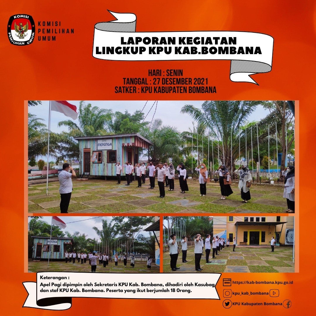 Menjelang berakhirnya tahun 2021, tetap diselenggarakan apel pagi di depan kantor KPU Kabupaten Bombana. Bertindak sebagai penerima apel adalah Andi Agusaling, SP, Sekretaris KPU Kabupaten Bombana.