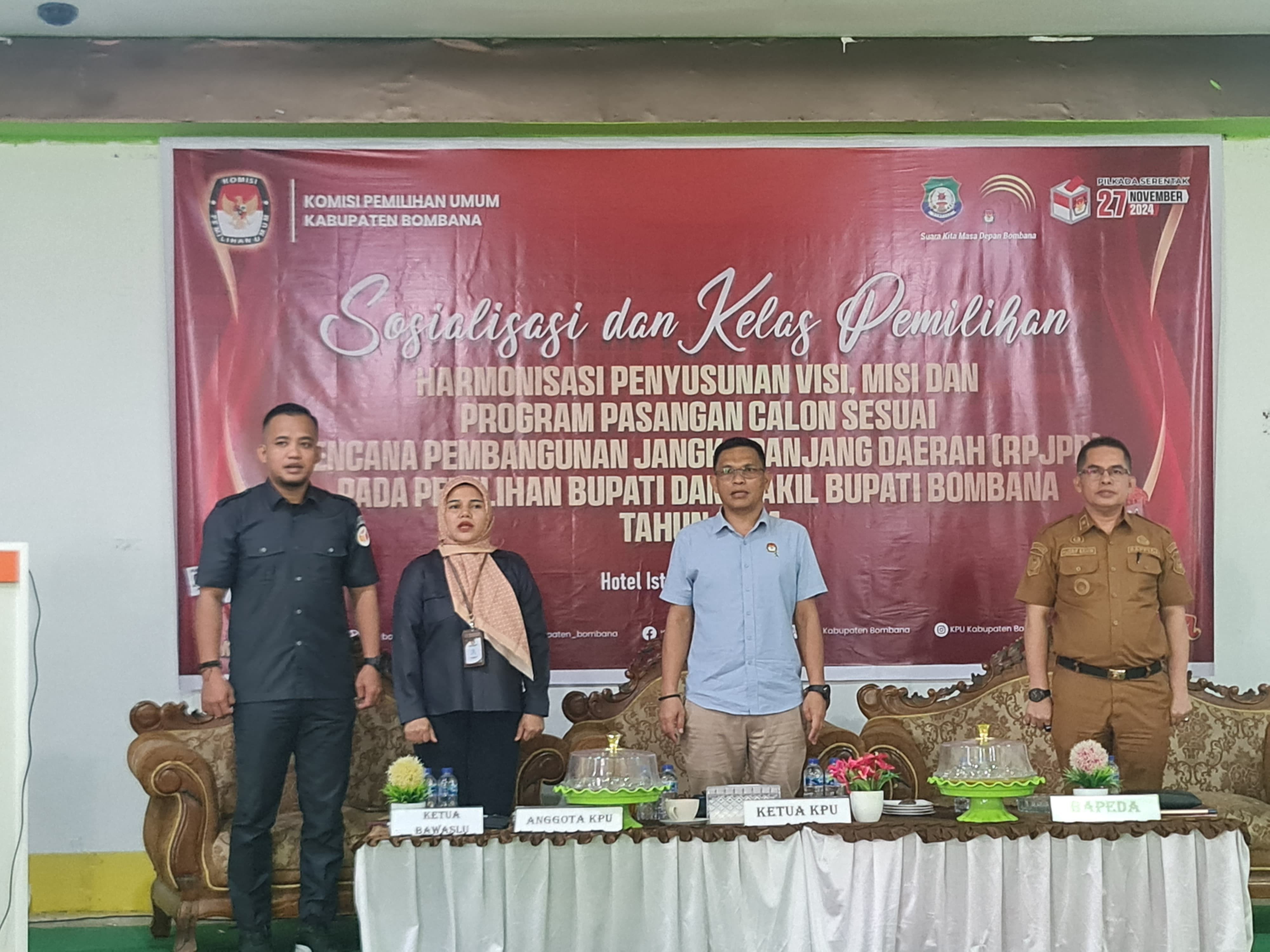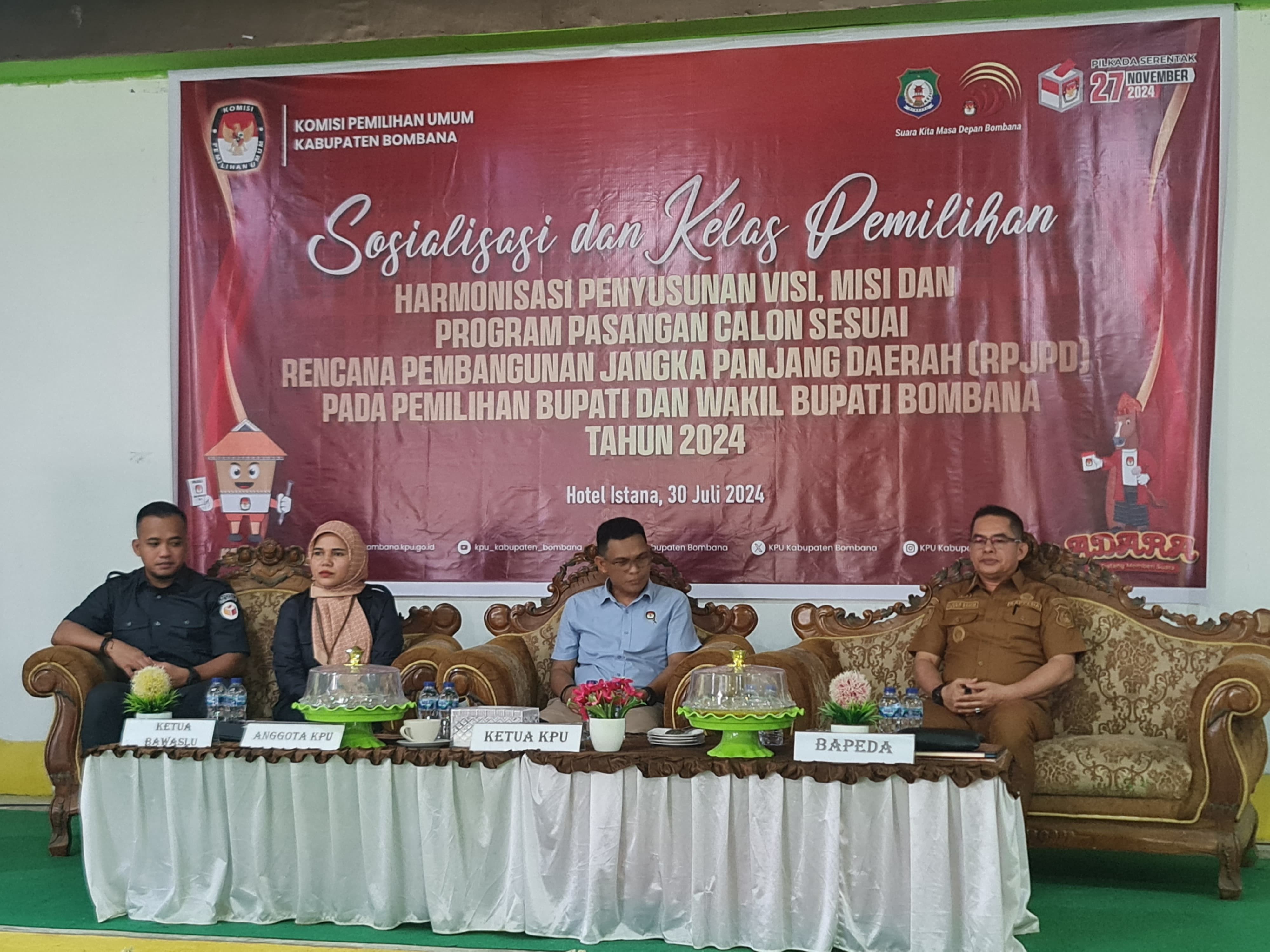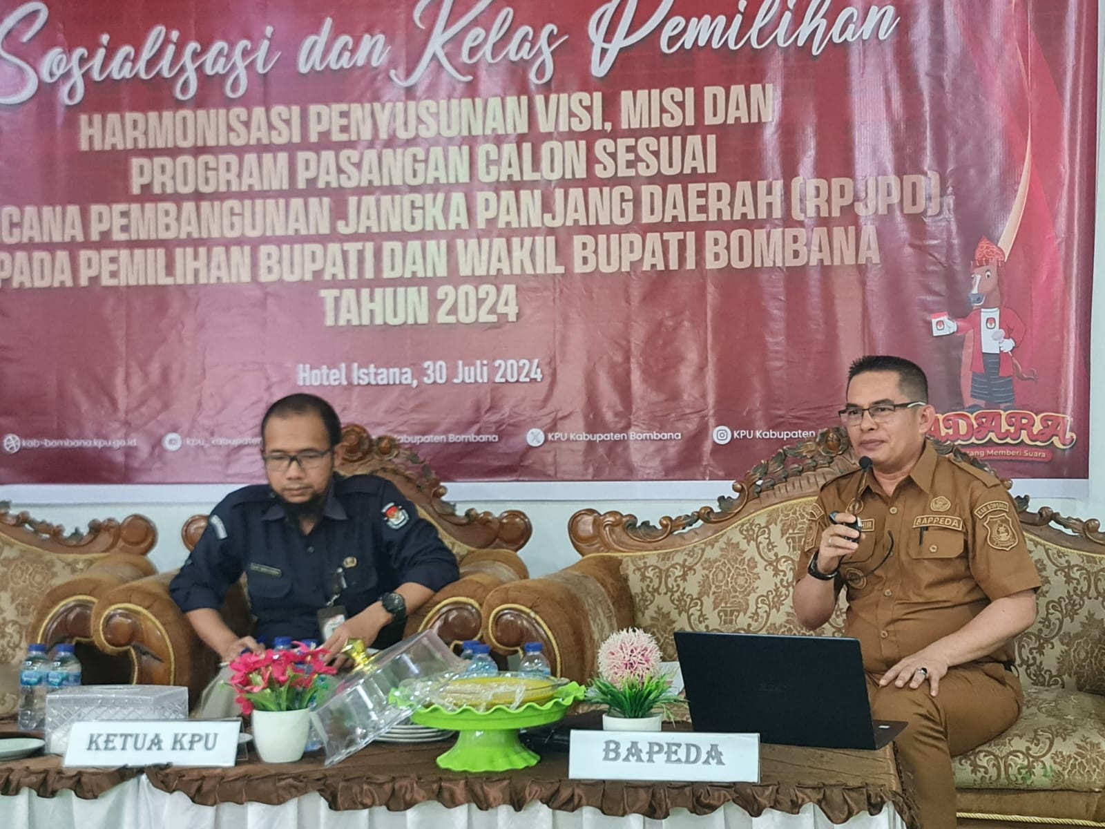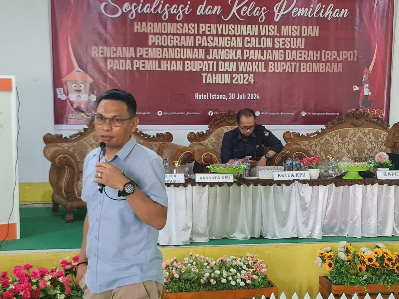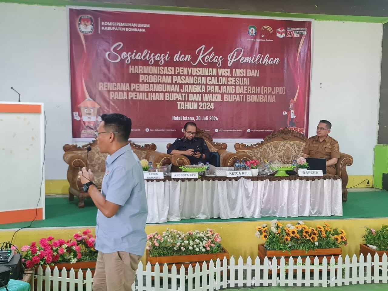 KPU Kabupaten Bombana menindaklanjuti Surat KPU nomor 1215/PL.02.2-SD/05/2024 tanggal 7 Juli 2024 tentang Sosialisasi Terkait Penyusunan Visi, Misi, dan Program Bakal Pasangan Calon (Bapaslon) sesuai dengan Rencana Pembangunan Jangka Panjang Daerah (RPJPD) pada Pemilihan Bupati dan Wakil Bupati Bombana Tahun 2024. Bekerjasama dengan Kepala Badan Perencanaan Pembangunan Daerah (Bappeda) Kabupaten Bombana, Husrifnah Rahim, yang hadir langsung sebagai narasumber.