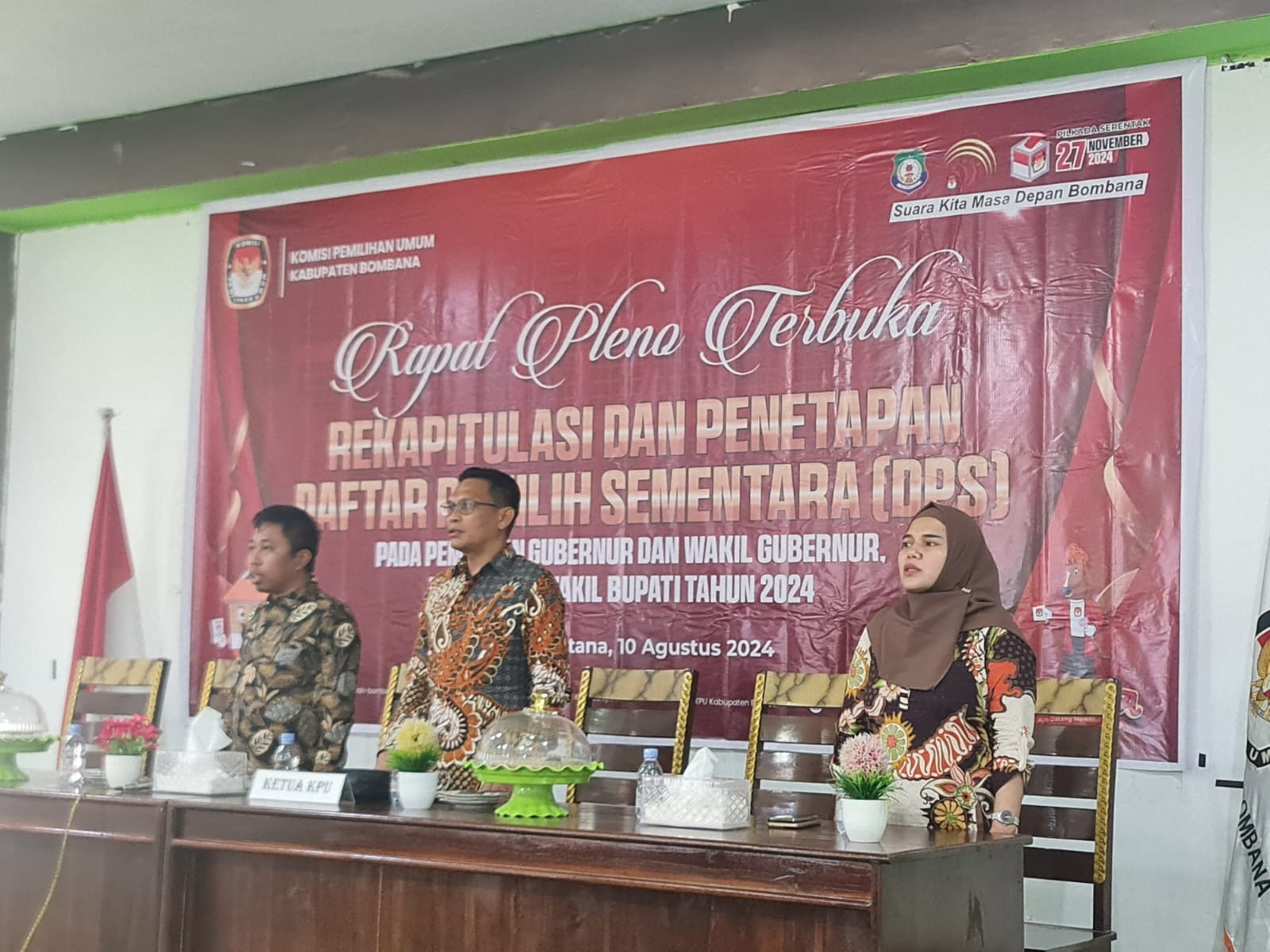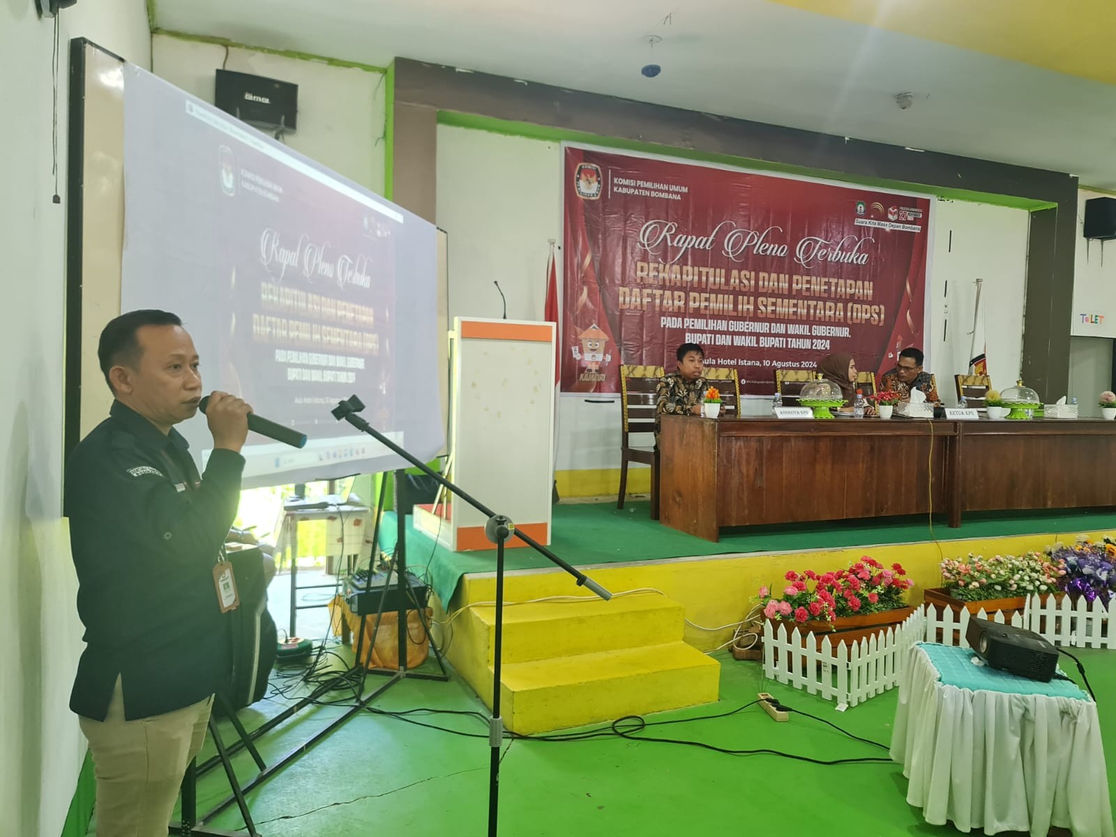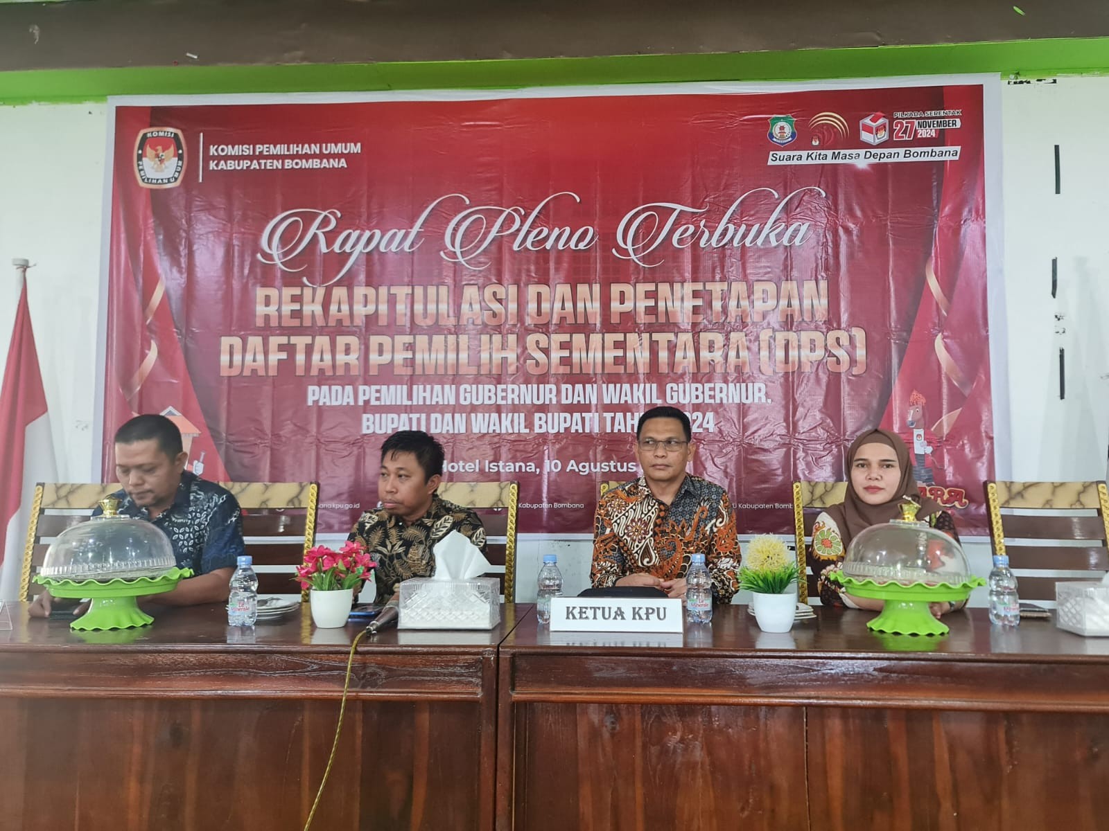 Sabtu (10/8/2024), telah dilakukan rapat pleno terbuka rekapitulasi Daftar Pemilih Sementara (DPS) tingkat Kabupaten Bombana untuk Pemilihan Gubernur dan Wakil Gubernur Sulawesi Tenggara (Pilgub Sultra) serta Pemilihan Bupati dan Wakil Bupati (Pilbup) Bombana Tahun 2024. Rapat tersebut dilakukan di Hotel Istana, Kelurahan Poea, Kecamatan Rumbia Tengah. Dihadiri oleh semua komisioner KPU Kabupaten Bombana. Dokumentasi kegiatannya di bawah ini: