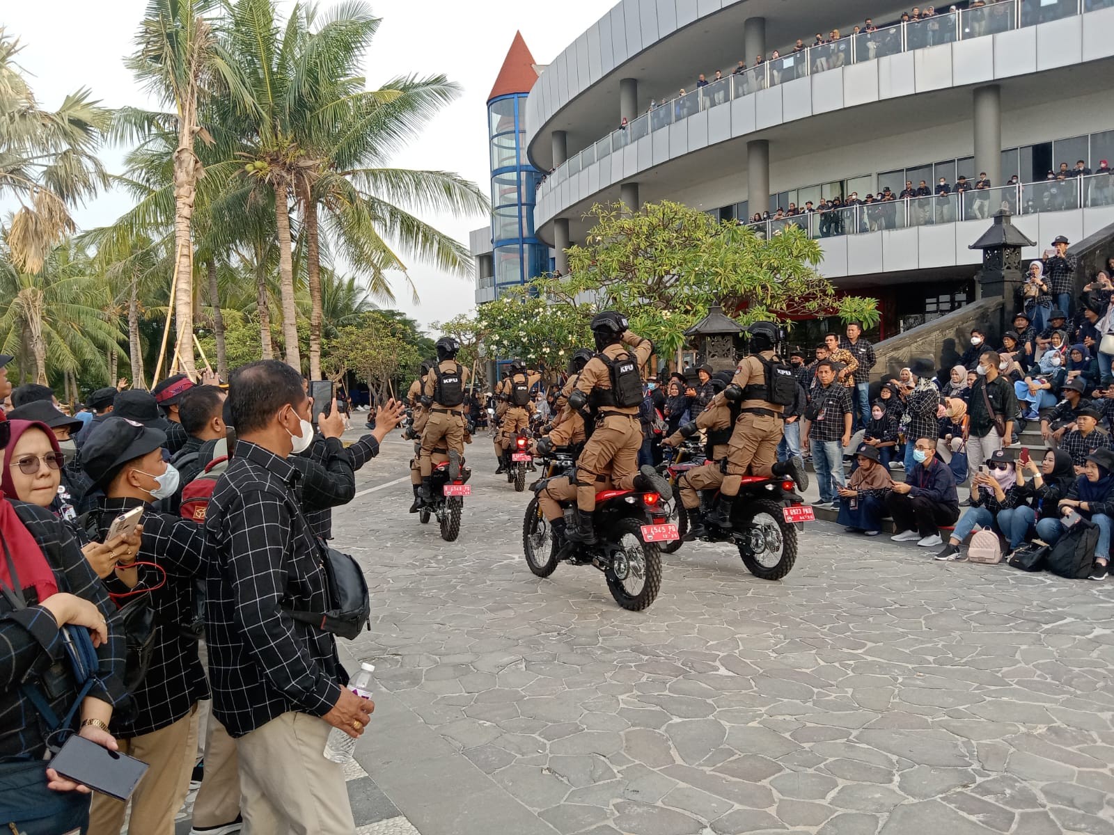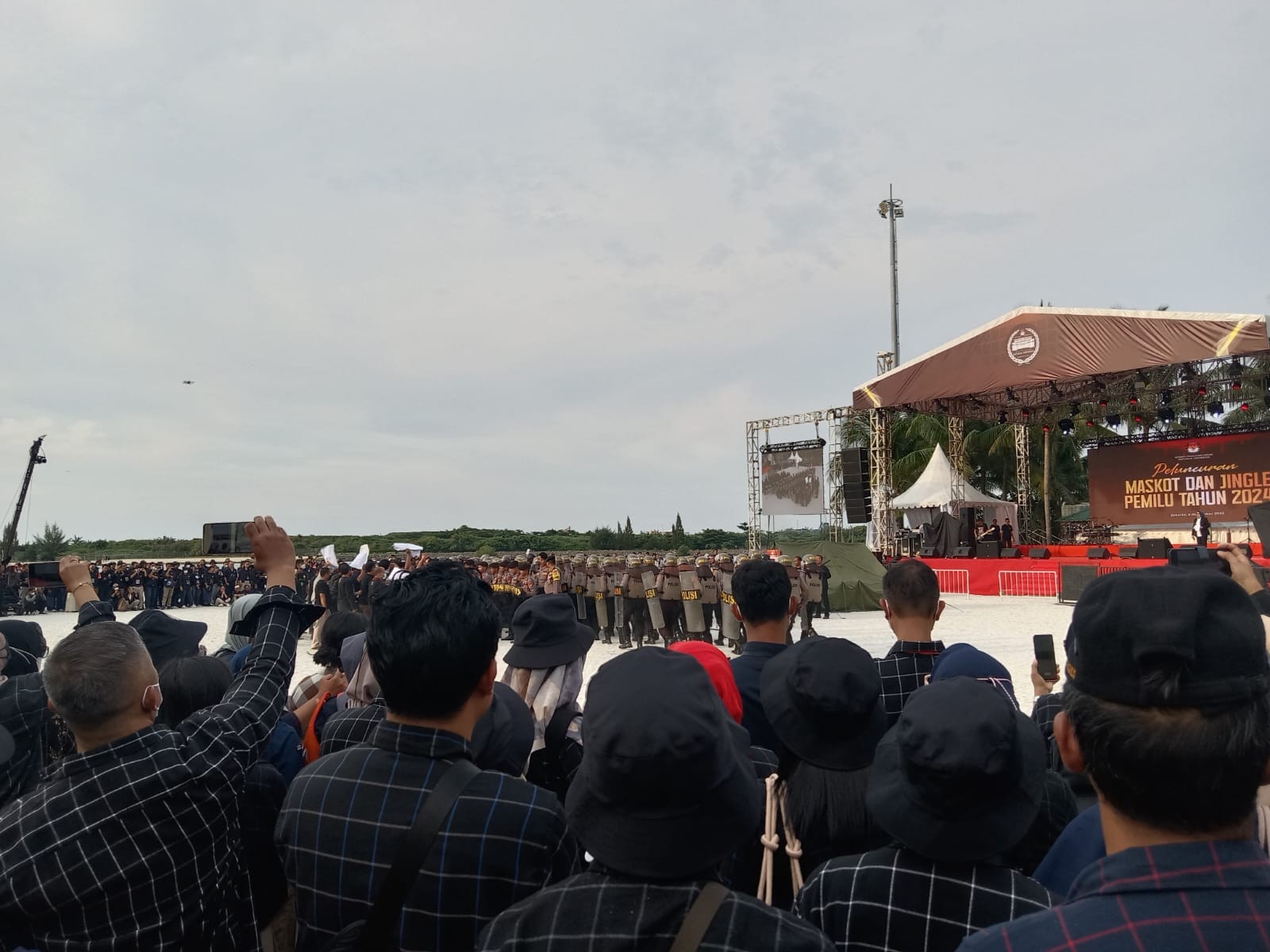Sebelum maskot Pemilu 2024 benar-benar diluncurkan, diperagakan simulasi pengendalian keamanan di kantor KPU pada sore hari pukul 16.28 WIB. Mengambil skenario demonstrasi yang tidak setuju dengan keputusan KPU Banten.