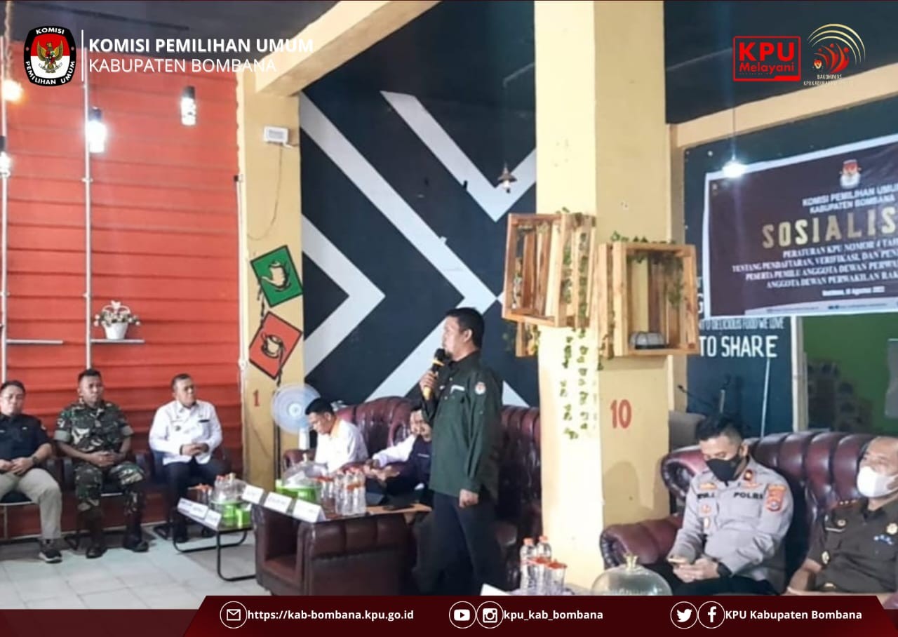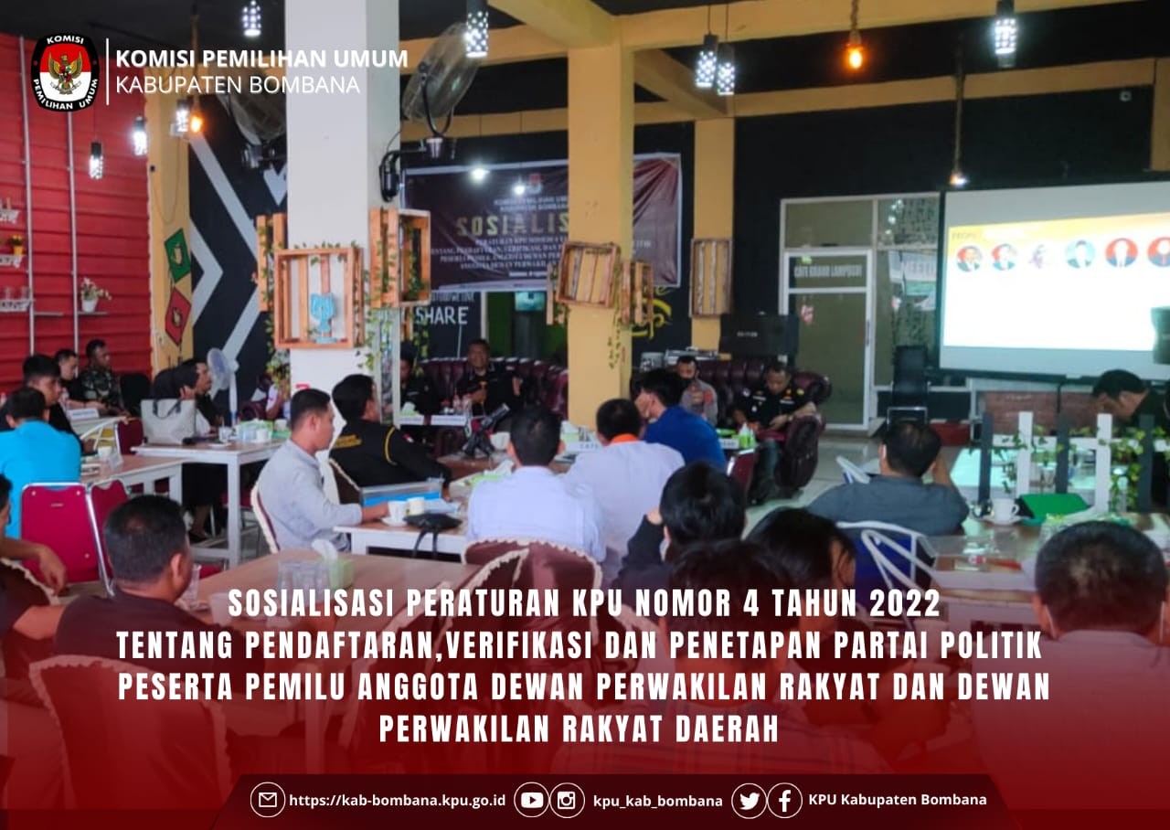 Pada Rabu (10/8/2022) mulai pukul 09.30 WITA, KPU Kabupaten Bombana menggelar sosialisasi Peraturan KPU Nomor 4 tentang Pendaftaran, Verifikasi, dan Penetapan Partai Politik Peserta Pemilihan Umum Anggota Dewan Perwakilan Rakyat dan Dewan Perwakilan Rakyat Daerah. Untuk pertama kalinya, kegiatan ini mengambil tempat di Kafe Grand Lampusui, Kecamatan Rumbia.