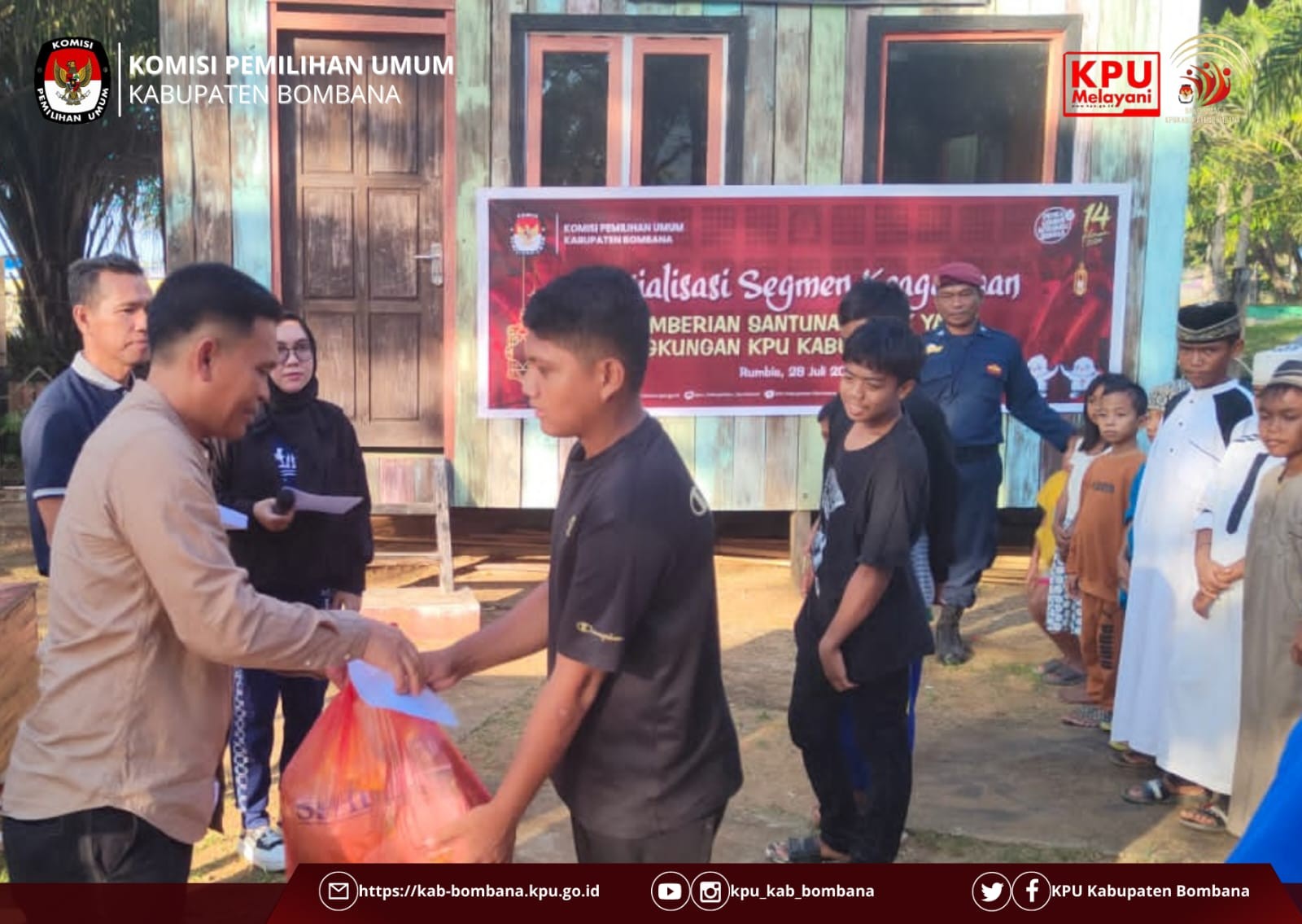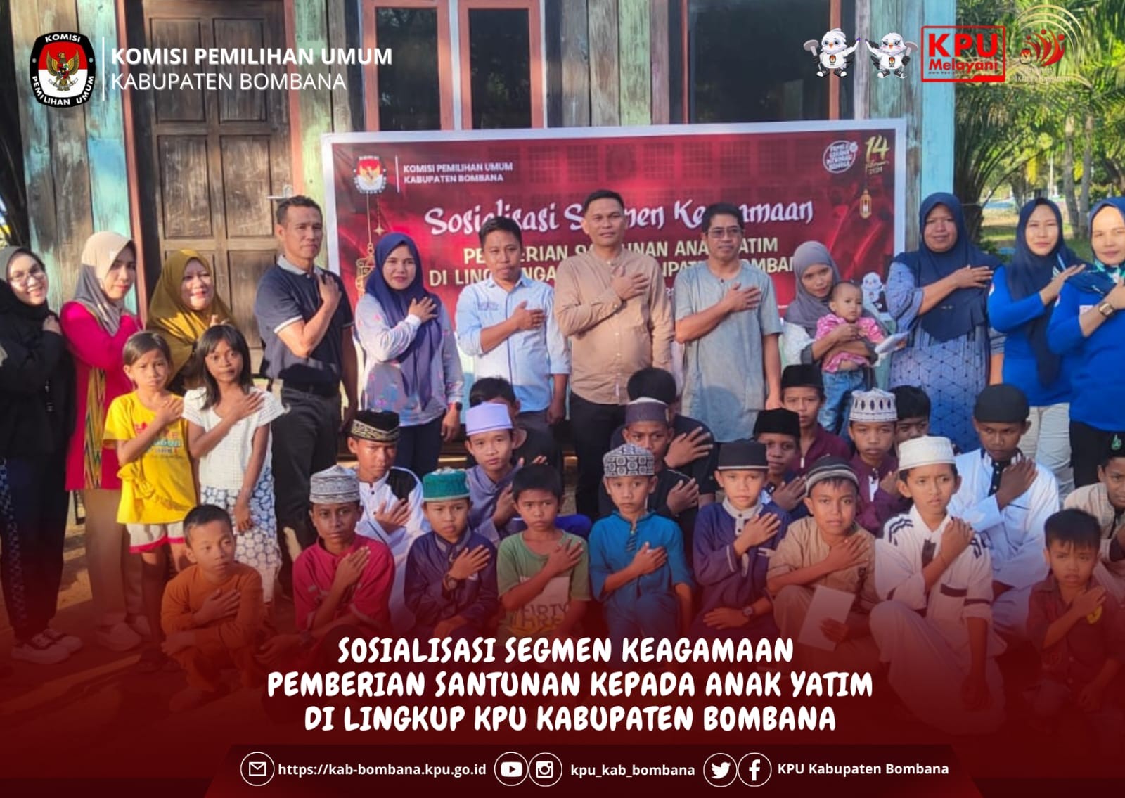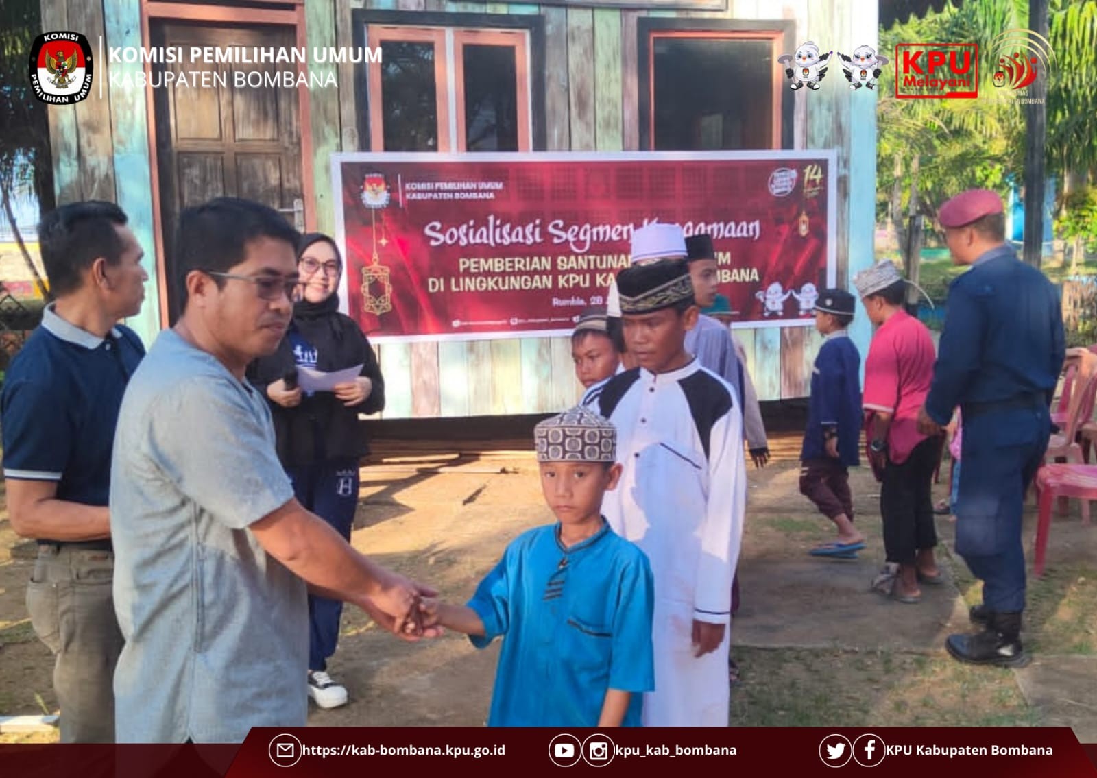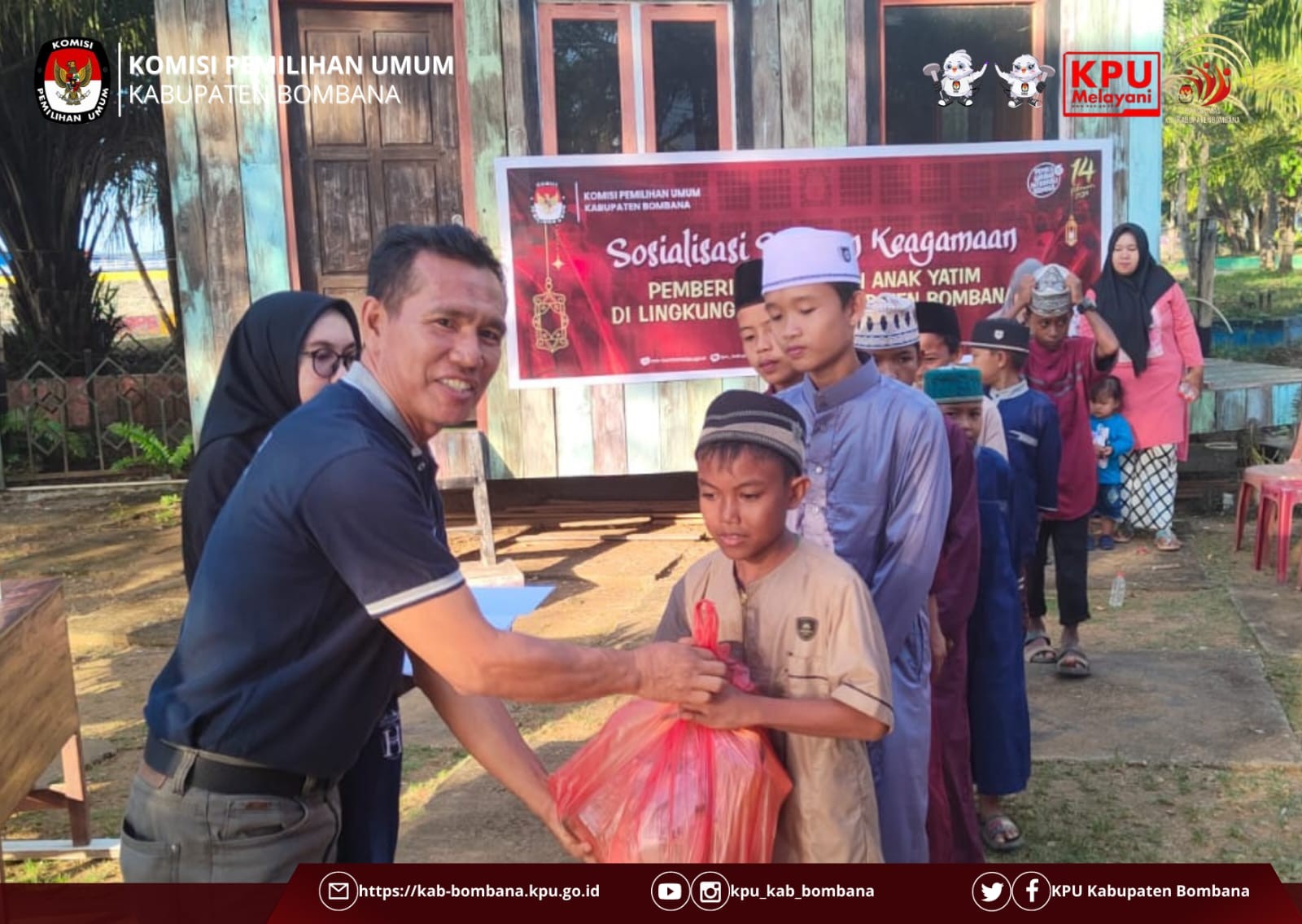 Sesuai arahan dari Sekretaris Jenderal KPU RI, sebagai sarana untuk meningkatkan silaturahmi dan solidaritas antarsesama, maka KPU Kabupaten Bombana mengadakan pemberian santunan anak yatim yang diselenggarakan di depan kantor lembaga penyelenggara Pemilu tersebut.