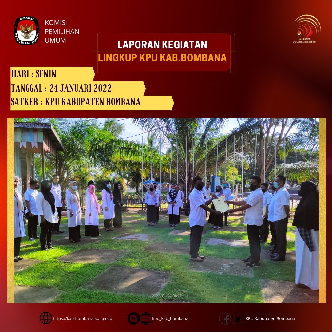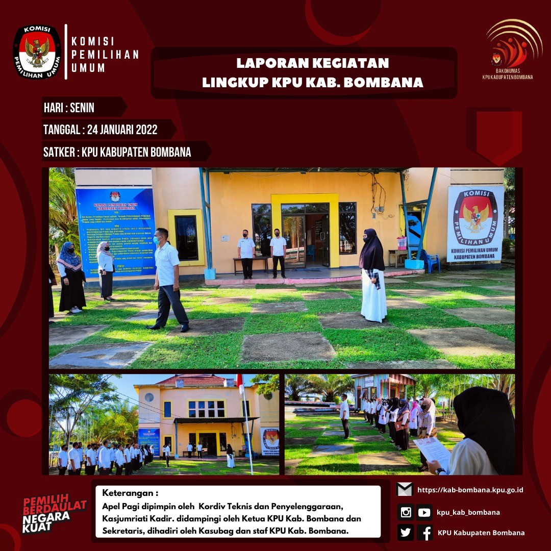 Apel pagi ini juga semakin dipertegas dengan surat dari Ketua KPU RI nomor: 52/SDM.03.5/04/2022 tanggal 21 Januari tentang himbauan apel pagi di lingkungan KPU RI. Surat ditujukan kepada seluruh pejabat dan pegawai, termasuk tentu saja di lingkungan KPU Kabupaten Bombana.