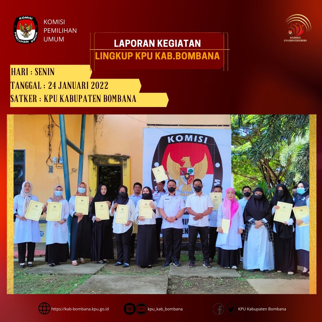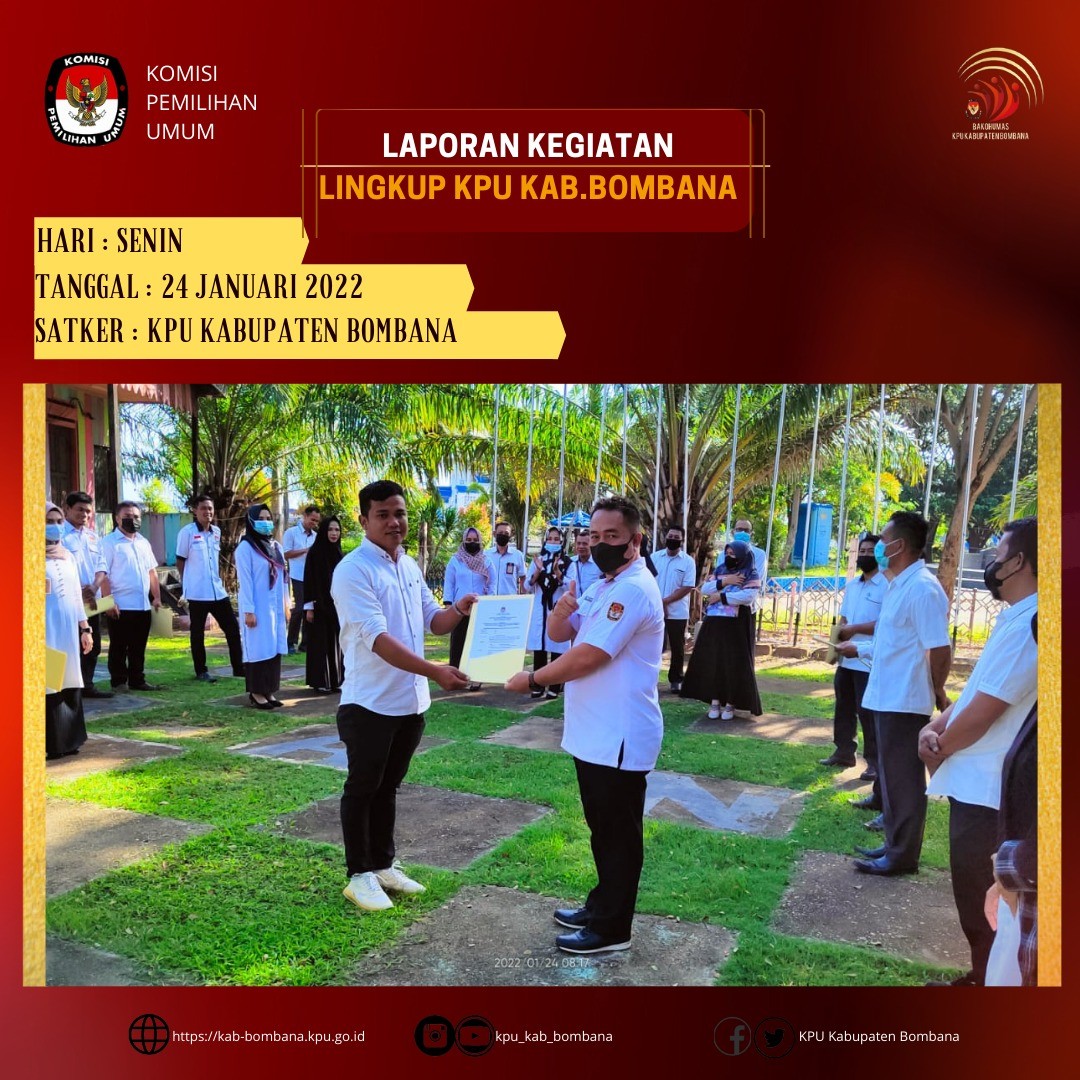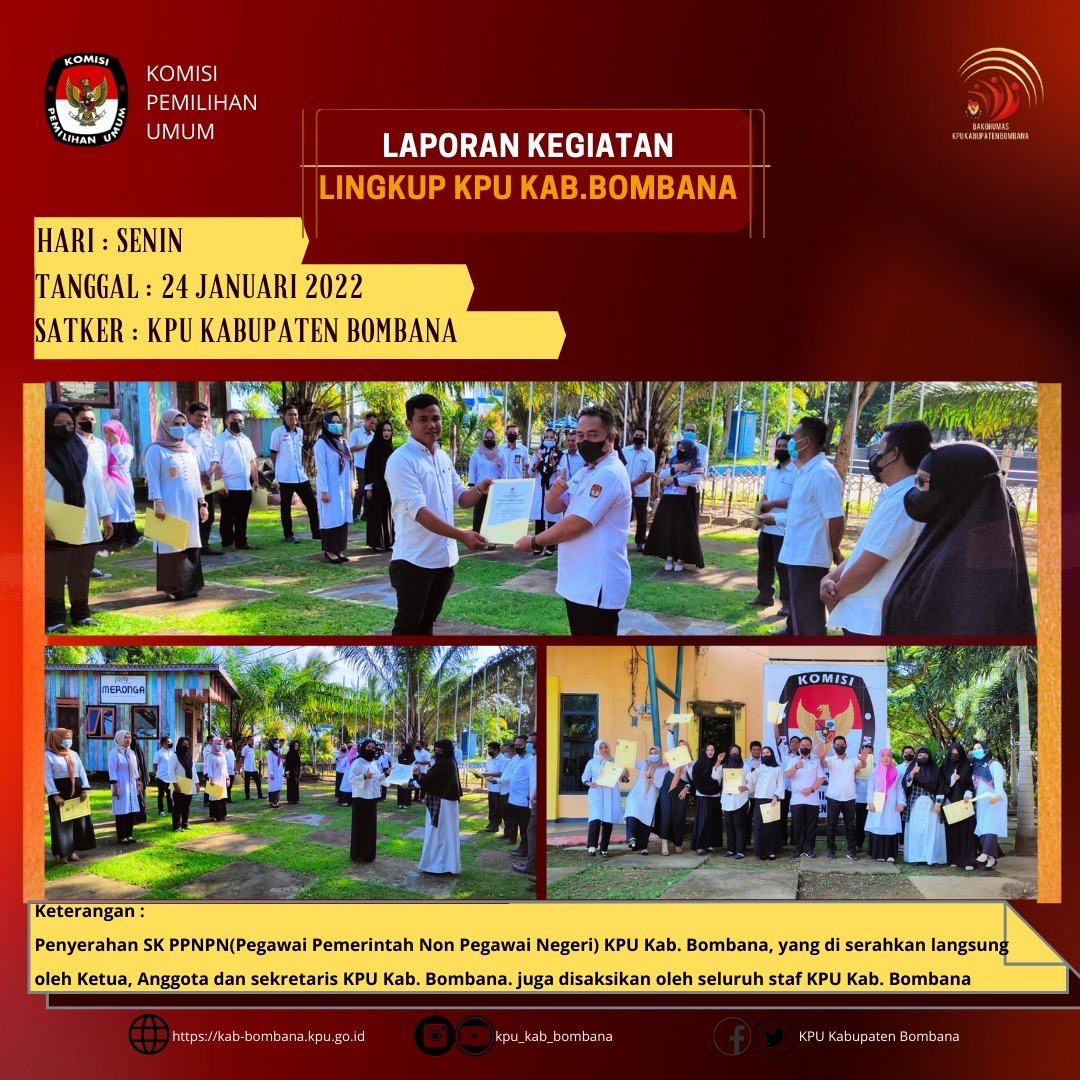 Kali ini, setelah apel, diberikan Surat Keputusan (SK) dari Sekretaris KPU Provinsi Sulawesi Tenggara nomor: 27/SDM.03.1/74/2022 tanggal 12 Januari tentang pengangkatan Pegawai Pemerintah Non Pegawai Negeri pada Sekretariat KPU Komisi Pemilihan Umum Kabupaten Bombana tahun 2022.