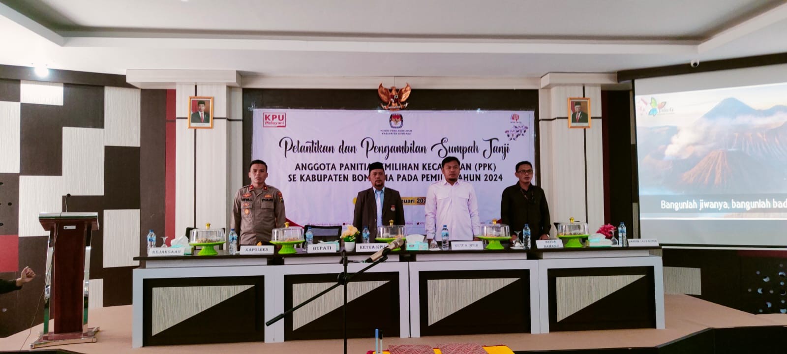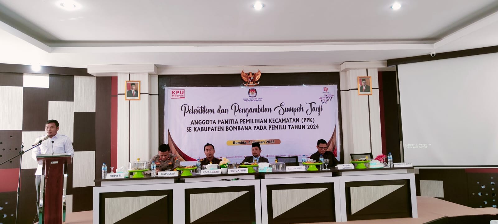 Pertama kalinya dalam tahapan Pemilu tahun 2024, pelantikan, pengambilan sumpah janji, dan bimbingan teknis (bimtek) Panitia Pemilihan Kecamatan (PPK) untuk wilayah Kabupaten Bombana dilaksanakan di Aula King Abdul Aziz, Kementerian Agama Kabupaten Bombana. Kegiatan tersebut dilaksanakan hari ini, Rabu (04/01/2023) dimulai sekitar pukul 09.30 WITA dengan dibuka oleh MC, Winda Wulandari, staf Subbagian Perencanaan, Data, dan Informasi.