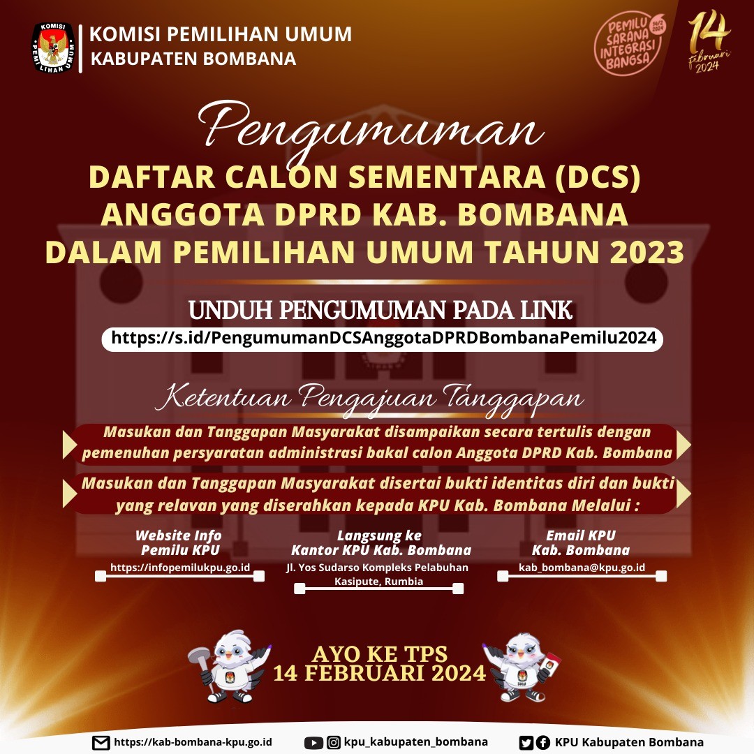 KPU Kabupaten Bombana mengumumkan Daftar Calon Sementara (DCS) Anggota DPRD Kabupaten Bombana pada Pemilihan Umum Tahun 2024 dengan pengumuman Nomor 292/PL.01.5-PU/7406/2/2023.dan untuk informasi lebih lanjut dapat klik PENGUMUMAN DCS ANGGOTA DPRD KABUPATEN BOMBANA PEMILU 2024.