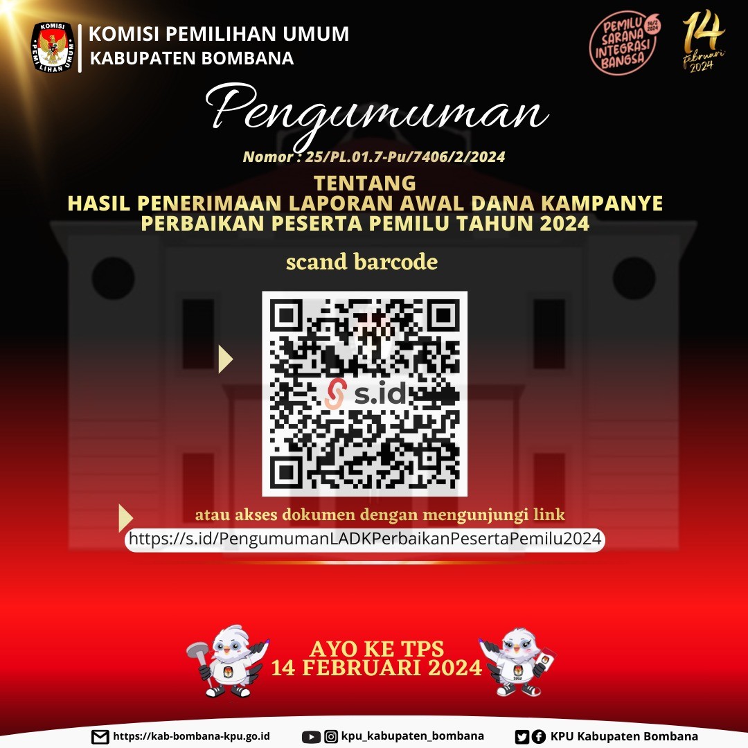 Bagi Anda, masyarakat maupun bagian dari peserta Pemilu tahun 2024, silakan melihat atau mengunduh Pengumuman Hasil Penerimaan Laporan Awal Dana Kampanye Perbaikan Peserta Pemilihan Umum Tahun 2024 yang dapat Anda peroleh DI SINI!