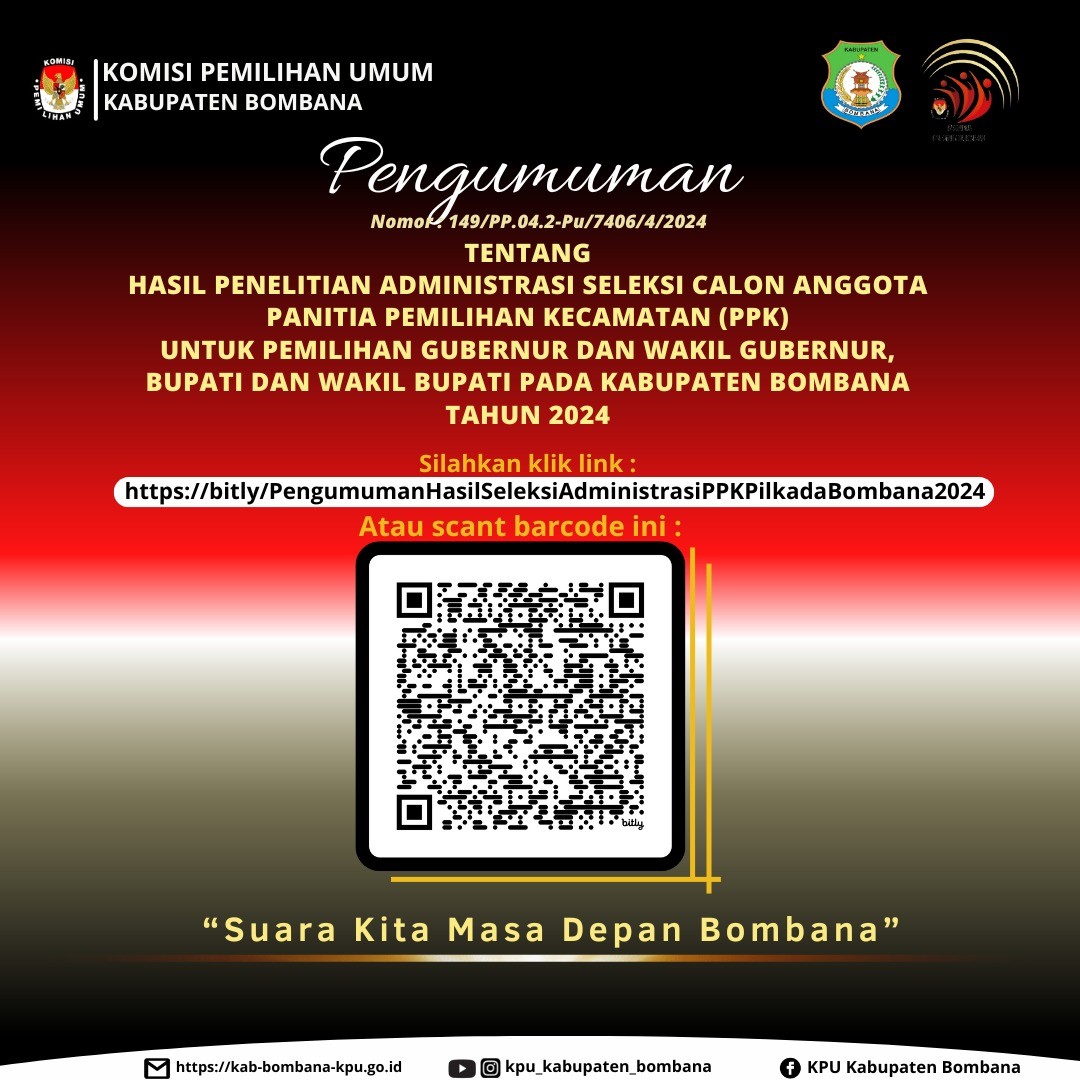 Berikut disampaikan pengumuman hasil seleksi administrasi terhadap para calon anggota Panitia Pemilihan Kecamatan (PPK) pada Pemilihan Bupati dan Wakil Bupati Bombana Tahun 2024. Silakan bisa klik link: Hasil Seleksi Administrasi Calon Anggota PPK Pilkada Bombana 2024.