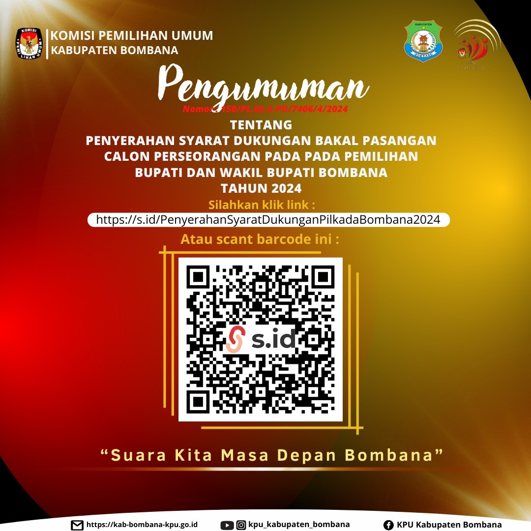 Bagi warga masyarakat Bombana yang ingin maju sebagai bakal calon perseorangan dalam Pemilihan Bupati dan Wakil Bupati Bombana Tahun 2024, silakan merujuk ke ketentuan sebagai berikut, silakan klik: Penyerahan Syarat Dukungan Bakal Paslon Perseorangan Pilkada Bombana 2024.