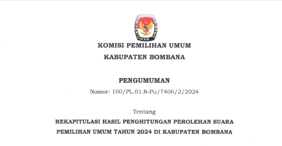 Pengumuman tentang Rekapitulasi Hasil Penghitungan Perolehan Suara Tingkat Kabupaten Bombana dalam Pemilihan Umum Tahun 2024