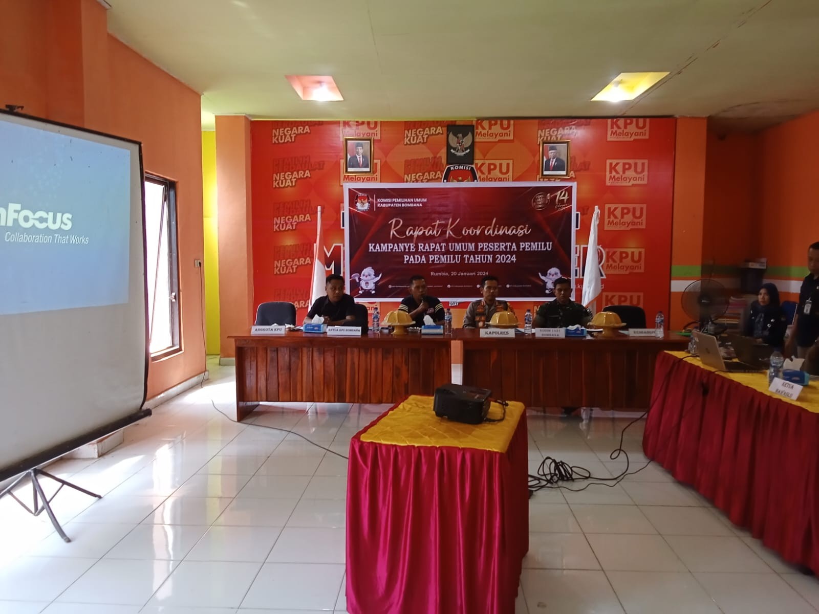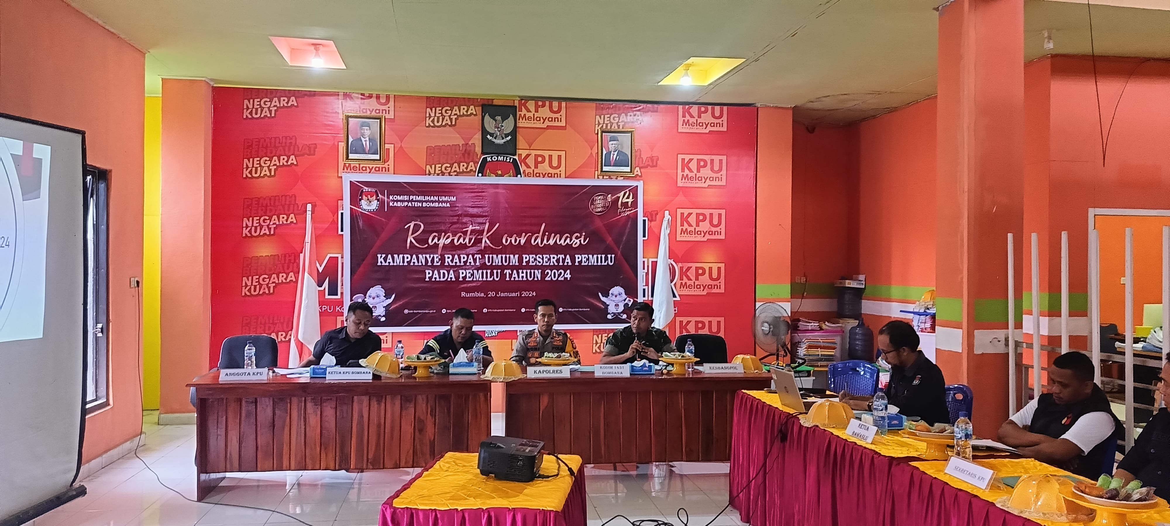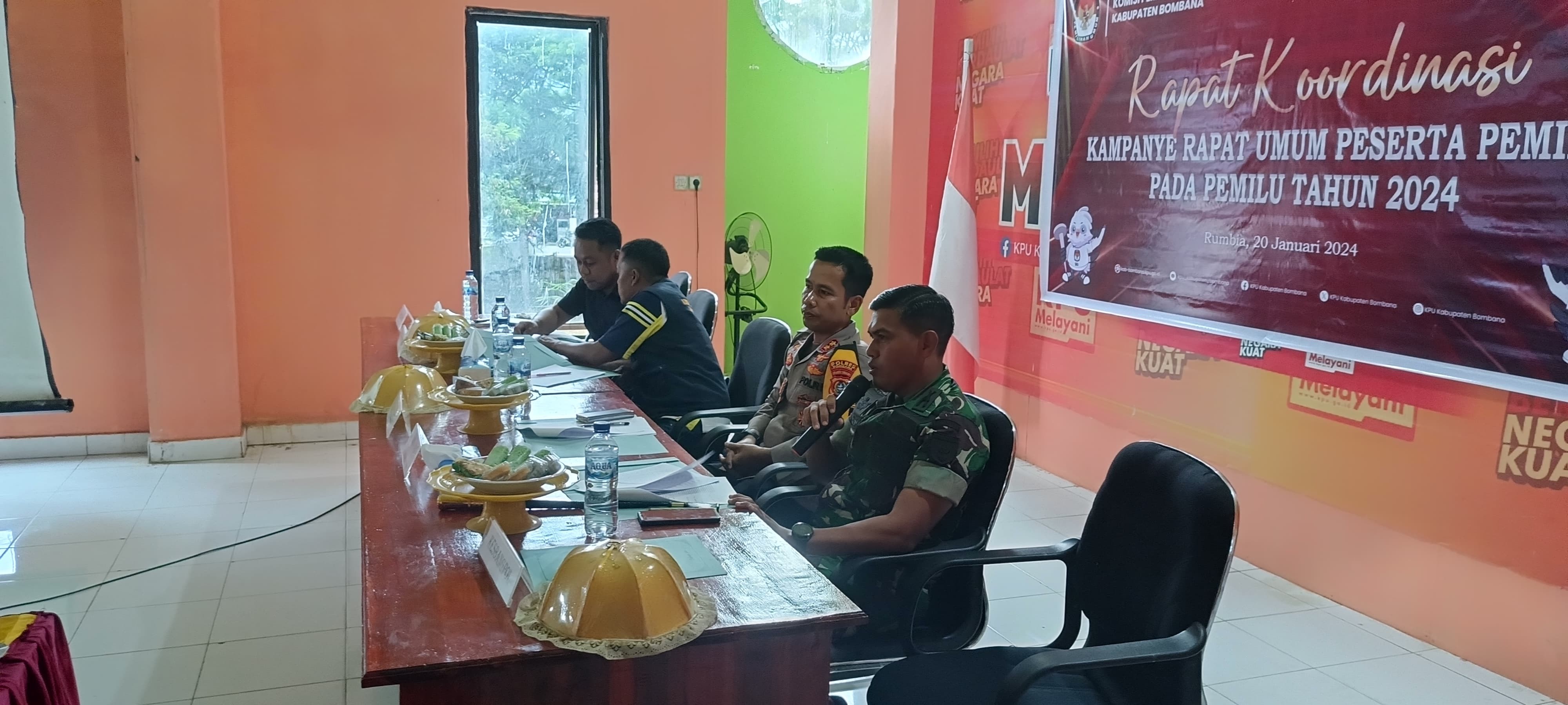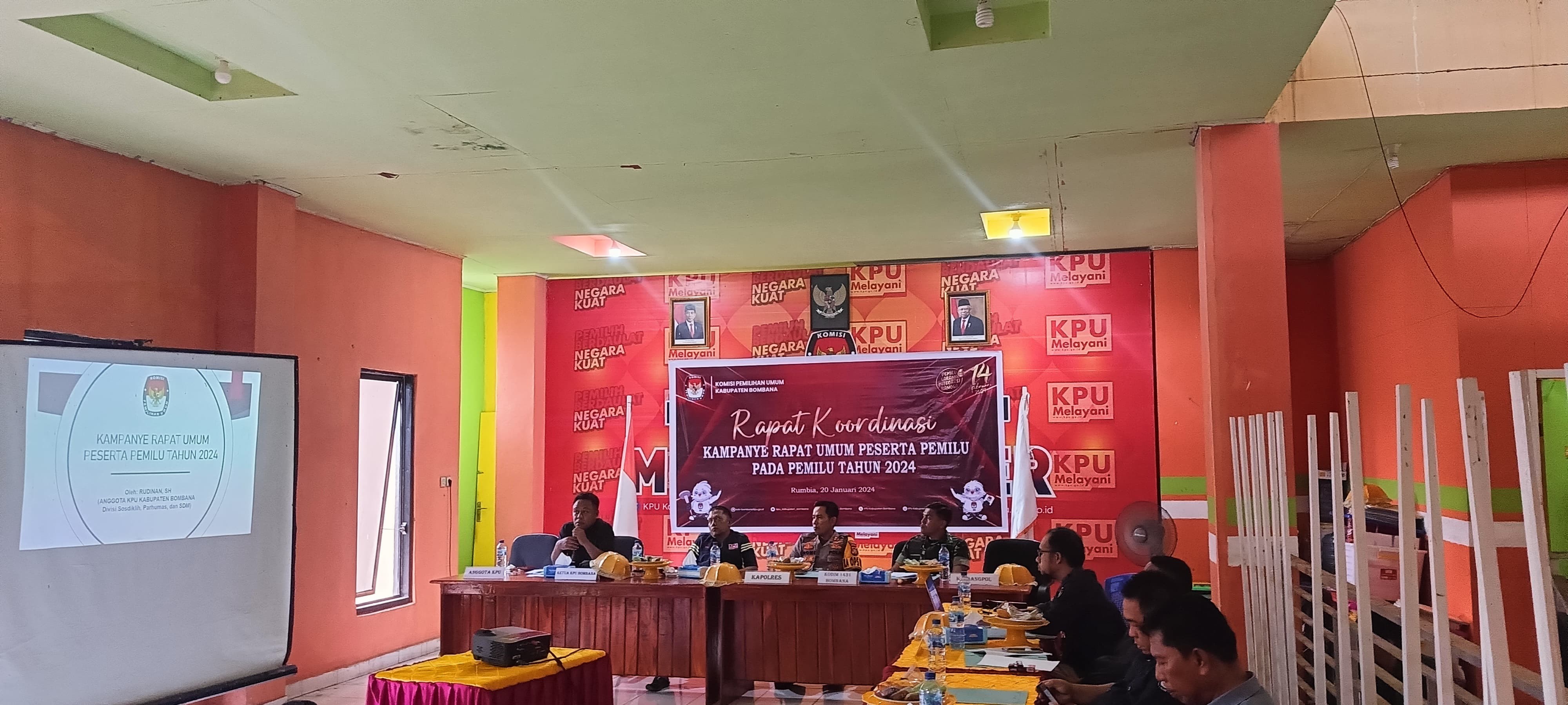 Sehari sebelum pelaksanaan kampanye rapat umum bagi peserta Pemilu tahun 2024, diadakan rapat koordinasi terlebih dahulu. Dalam Rapat Koordinasi Rapat Umum Peserta Pemilu pada Pemilu Tahun 2024 ini, hadir dua komisioner, yaitu: Plh. Ketua, Aminuddin yang merupakan Kepala Divisi Hukum dan Pengawasan serta Rudinan sebagai Kepala Divisi Sosialisasi, Pendidikan Pemilih, Partisipasi Masyarakat, dan Sumber Daya Manusia. Sementara tiga komisioner lainnya, termasuk Ketua KPU Kabupaten Bombana, Hasdin Nompo, sedang dalam perjalanan dinas keluar daerah.