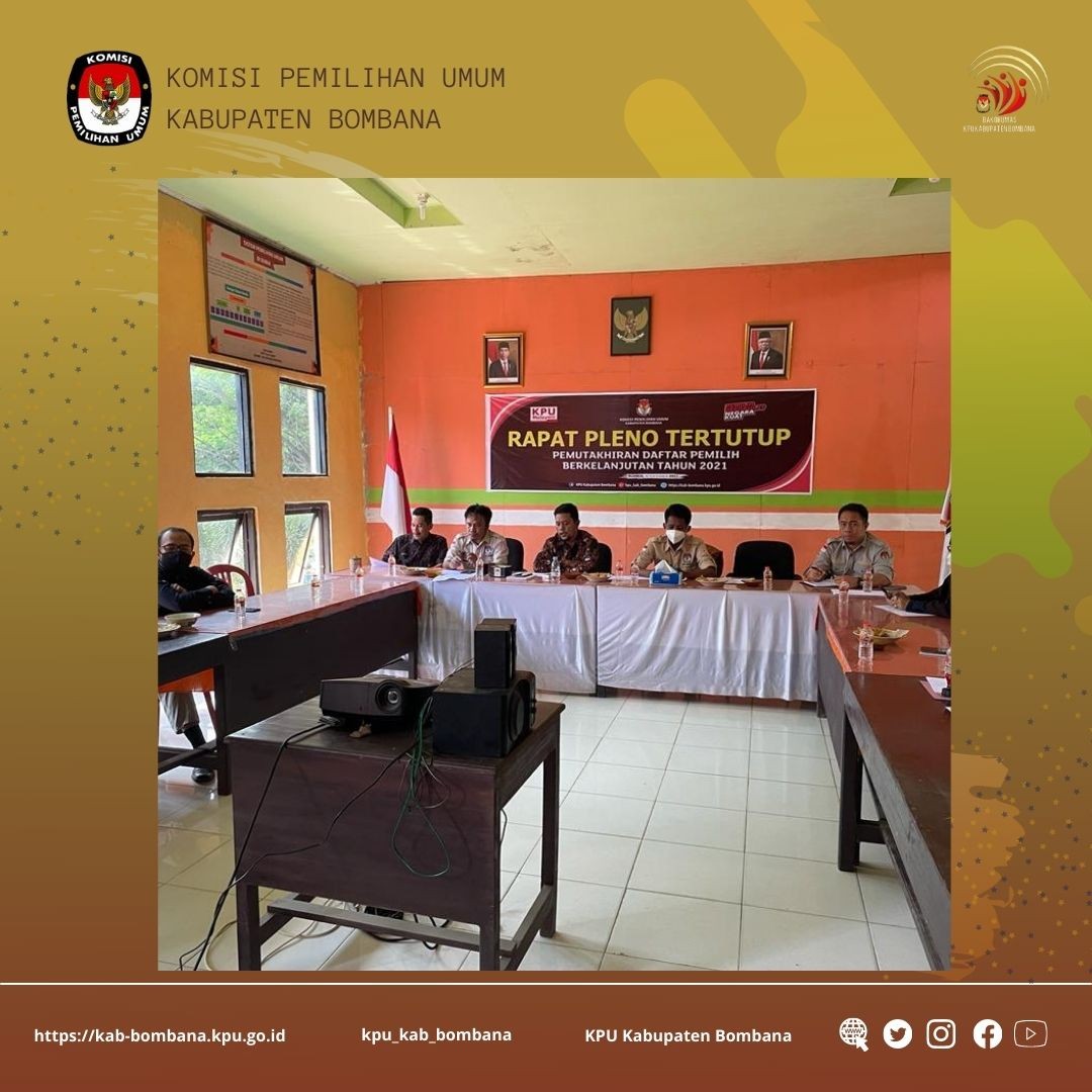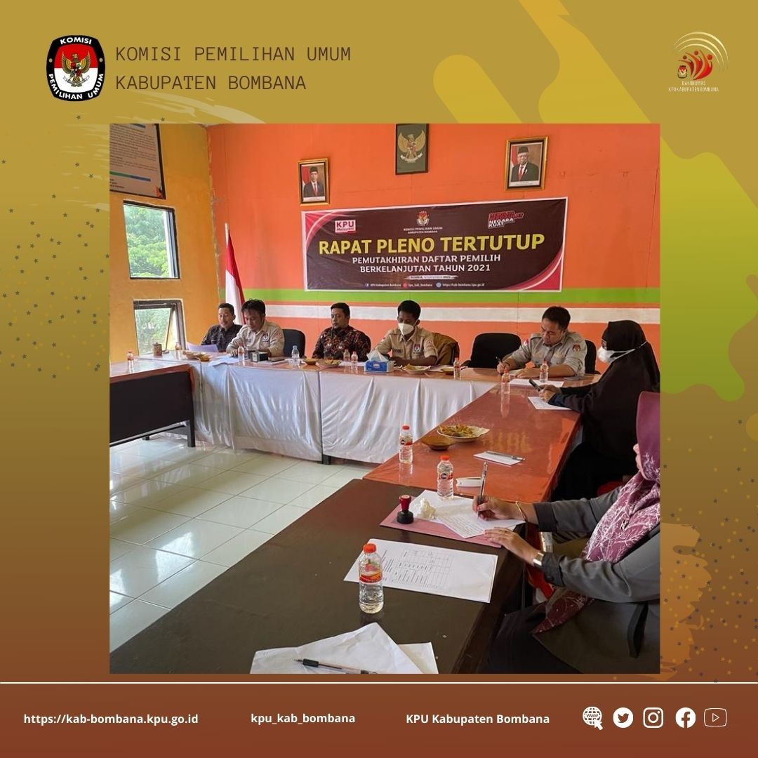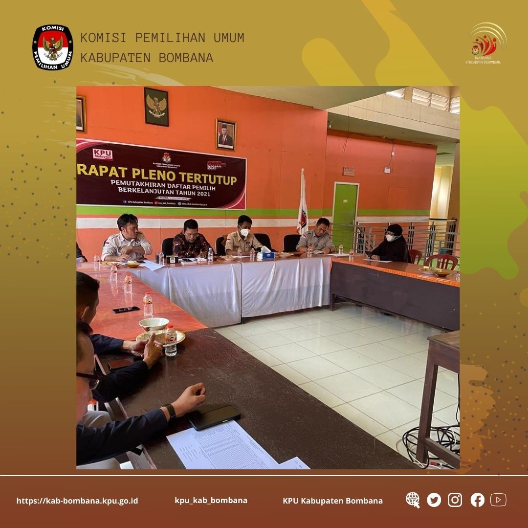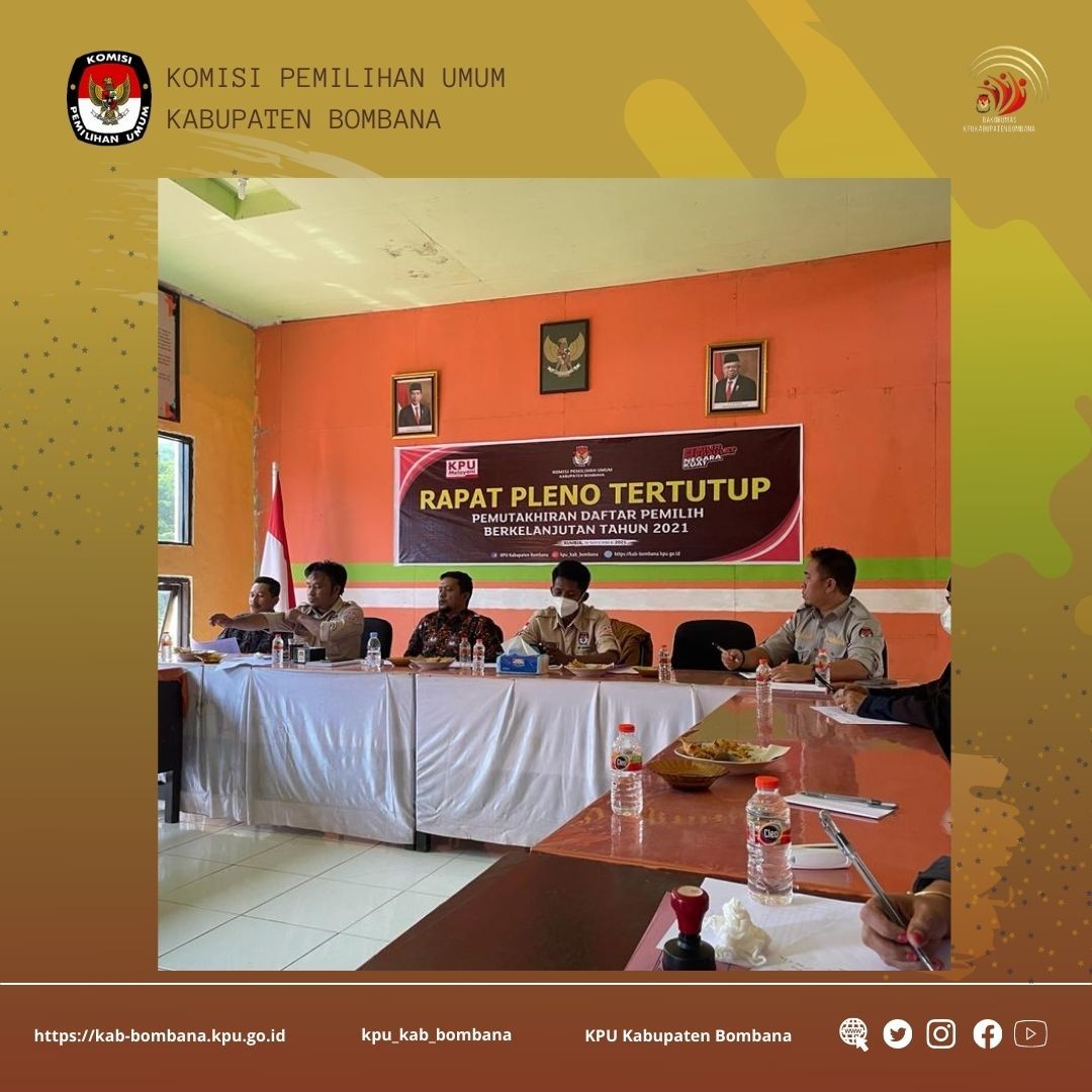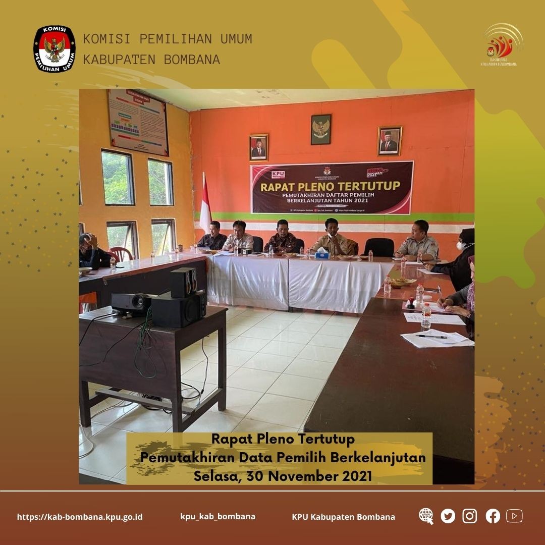 Bertempat di ruangan aula lantai dua kantor KPU Kabupaten Bombana, dilaksanakan rapat pleno tertutup Pemutakhiran Data Pemilih Berkelanjutan periode November 2021. Rapat ini dihadiri lengkap oleh semua komisioner KPU Kabupaten Bombana. Tidak terkecuali Sekretaris, Andi Agusaling, dan para kasubbag, serta beberapa staf di subbagian Program dan Data, serta satu orang staf dari subbagian Hukum.